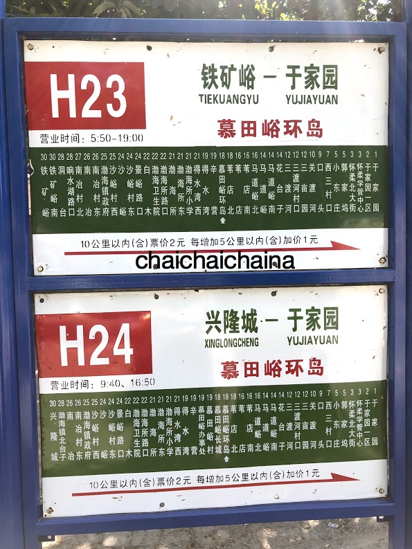 H23/H24/H36/H50のいずれかの路線バスで万里の長城まで行くことが可能です。バス停に下の写真のような行き先表示がある看板が置かれています。ここからのバスは、車内に停留所の表示がないことがあるので写真を取って駅数を数えるか百度地図を眺めて現在地を確認しておくことをおすすめします。中国旅行の際には、百度地図が欠かせません。使い方は、中国旅行に必携の百度地图の使い方をご参照ください。